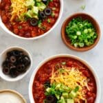 - Serve and garnish: Ladle the chili into bowls and top with your choice of sour cream, avocado slices, shredded cheddar cheese, and sliced scallions for added creaminess and freshness.