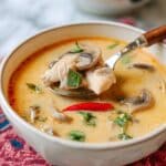 Tom Kha Gai is a classic Thai coconut chicken soup that perfectly balances sour, spicy, sweet, savory, and salty flavors. This comforting soup combines tender chicken, fragrant lemongrass, galangal, makrut lime leaves, creamy coconut milk, and a hint of Thai red curry paste, ready in just 30 minutes.