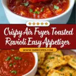 This Air Fryer Toasted Ravioli recipe offers a healthier twist on a classic appetizer by air frying ravioli coated in seasoned breadcrumbs and parmesan cheese, resulting in a crispy, golden-brown bite-perfect snack served with marinara sauce.