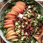 A vibrant Autumn Harvest Honeycrisp Apple and Feta Salad featuring toasted pecans and pumpkin seeds, crispy prosciutto, fresh arugula or kale, sweet and tart honeycrisp apples, creamy avocado, crunchy pomegranate arils, and tangy feta cheese, all tossed in a warming apple cider vinaigrette with a hint of warmth from cayenne and cinnamon.