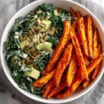 A vibrant and creamy Avocado Kale Caesar Salad paired perfectly with crispy sweet potato fries. This recipe features a quick, dairy-free dressing made from avocado, garlic, lemon, and Dijon mustard, tossed with fresh kale and topped with Parmesan and pepitas for added crunch and flavor. Ideal for a healthy, satisfying meal that’s easy to prepare in just 10 minutes.