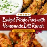 Crispy oven-baked pickle fries coated in a seasoned panko and cornmeal crust, served with a homemade dill ranch sauce that combines tangy buttermilk, fresh dill, and creamy Greek yogurt for a perfect party snack or appetizer.