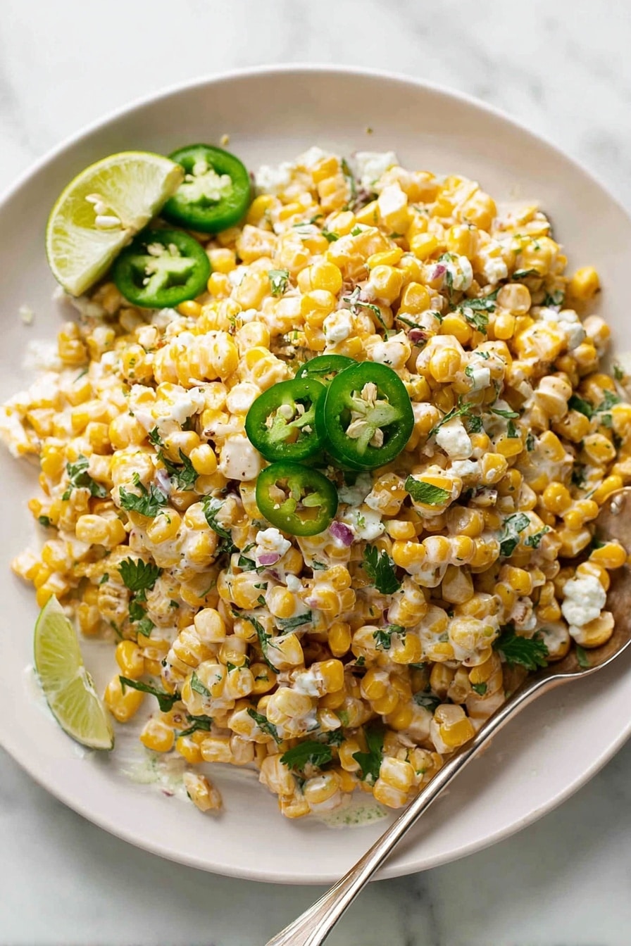 A white oval plate holds a layered corn salad with a creamy texture, featuring bright yellow corn kernels mixed with white creamy sauce and small green herb pieces throughout. There are finely chopped red onions and scattered white cheese crumbles visible within the salad. On top, several slices of fresh green jalapeño and chopped green herbs add color. A bright green lime wedge sits on the right edge of the plate. A spoon rests partly inside the dish near the front right edge, and two blurred lime wedges are in the background. The setting has a white marbled surface. Photo taken with an iphone --ar 2:3 --v 7 - Best Mexican Corn Salad, Mexican Corn Salad Recipe, Mexican Corn Salad Ingredients, Easy Corn Salad, Spicy Corn Salad