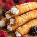 Traditional British Brandy Snaps are delicate, crispy, golden lacy tubes filled with sweetened whipped cream, flavored subtly with a hint of brandy. This holiday favorite delights with its perfect balance of sweetness and rich texture, making it an elegant and festive dessert.