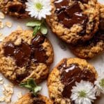 Deliciously chewy brown butter oatmeal chocolate chip cookies with crispy edges and a rich nutty flavor. These cookies are quick and easy to make without the need for creaming butter or chilling dough. Perfectly balanced with oats for texture and chopped dark chocolate for a decadent bite, yielding about 22 generous cookies approximately 7cm wide.