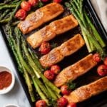 • Use Fresh Vegetables: Picking firm asparagus and ripe tomatoes ensures they roast perfectly alongside the salmon in the same time frame.