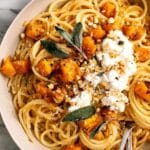 This Butternut Squash Pasta with Sage recipe features tender, caramelized butternut squash tossed with al dente pasta in a rich brown butter and crispy sage sauce. Finished with toasted walnuts, creamy ricotta, and freshly grated Parmesan, it’s a comforting and elegant dish perfect for a quick, flavorful meal.