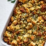 - Make Ahead and Reheat: This stuffing can be made a day ahead and refrigerated. Remove from the fridge about 60 minutes before reheating and then bake as directed to warm through.