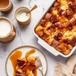- Serve: Once the bread pudding is baked, cut it into slices and serve it warm, drizzled generously with the homemade caramel sauce.