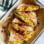 A quick and delicious breakfast quesadilla filled with scrambled eggs, beans, sharp cheddar cheese, and fresh herbs. Perfect for a protein-rich start to your day or a satisfying brunch, these quesadillas combine creamy beans, fluffy eggs, and melty cheese encased in a crispy whole grain tortilla.