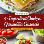 A simple and flavorful 4-Ingredient Chicken Quesadilla Casserole that layers tender cooked chicken, salsa, cheese, and flour tortillas baked to cheesy perfection. This quick and easy casserole is perfect for a weeknight dinner and can be customized with your favorite toppings for a delicious Tex-Mex meal.