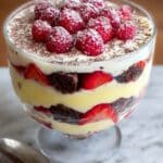This decadent Chocolate Brownie Trifle is a perfect dessert to impress your guests. Layers of rich chocolate brownies, homemade raspberry sauce, fresh strawberries, whipped cream, and creamy custard come together in a stunning glass dish. Finished with crumbled Flake chocolate and a dusting of icing sugar, this trifle is best served chilled after a few hours of refrigeration, letting all the flavors meld beautifully.
