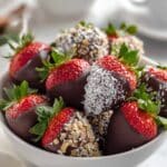 Delicious, bite-sized chocolate covered strawberries made with melted chocolate and your choice of coatings like desiccated coconut, crushed nuts, or sprinkles. This quick and easy dessert is perfect for lovers of fresh fruit and chocolate, ready in just 10 minutes and ideal for parties or a sweet treat.