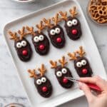 - Create Antlers: Insert two mini pretzels above the eyes to resemble antlers on each reindeer cookie.