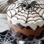 This Chocolate Spider Trifle is a deliciously layered dessert perfect for Halloween or any chocolate lover. Featuring moist chocolate cake, creamy chocolate pudding, crushed Oreos, and swirls of Hershey’s syrup, it’s topped with cool whip and a festive plastic spider for a fun spooky touch.