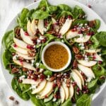 This Best Christmas Wreath Salad with Pomegranate and Pear is a festive, vibrant salad perfect for holiday entertaining. Featuring fresh baby spinach arranged in a wreath shape, adorned with sweet pear slices, juicy pomegranate arils, dried cranberries, toasted pecans glazed with maple syrup, and crumbled feta cheese. Finished with a tangy apple cider vinegar dressing, this salad is both visually stunning and deliciously light, making it an ideal side dish for your Christmas or winter gatherings.