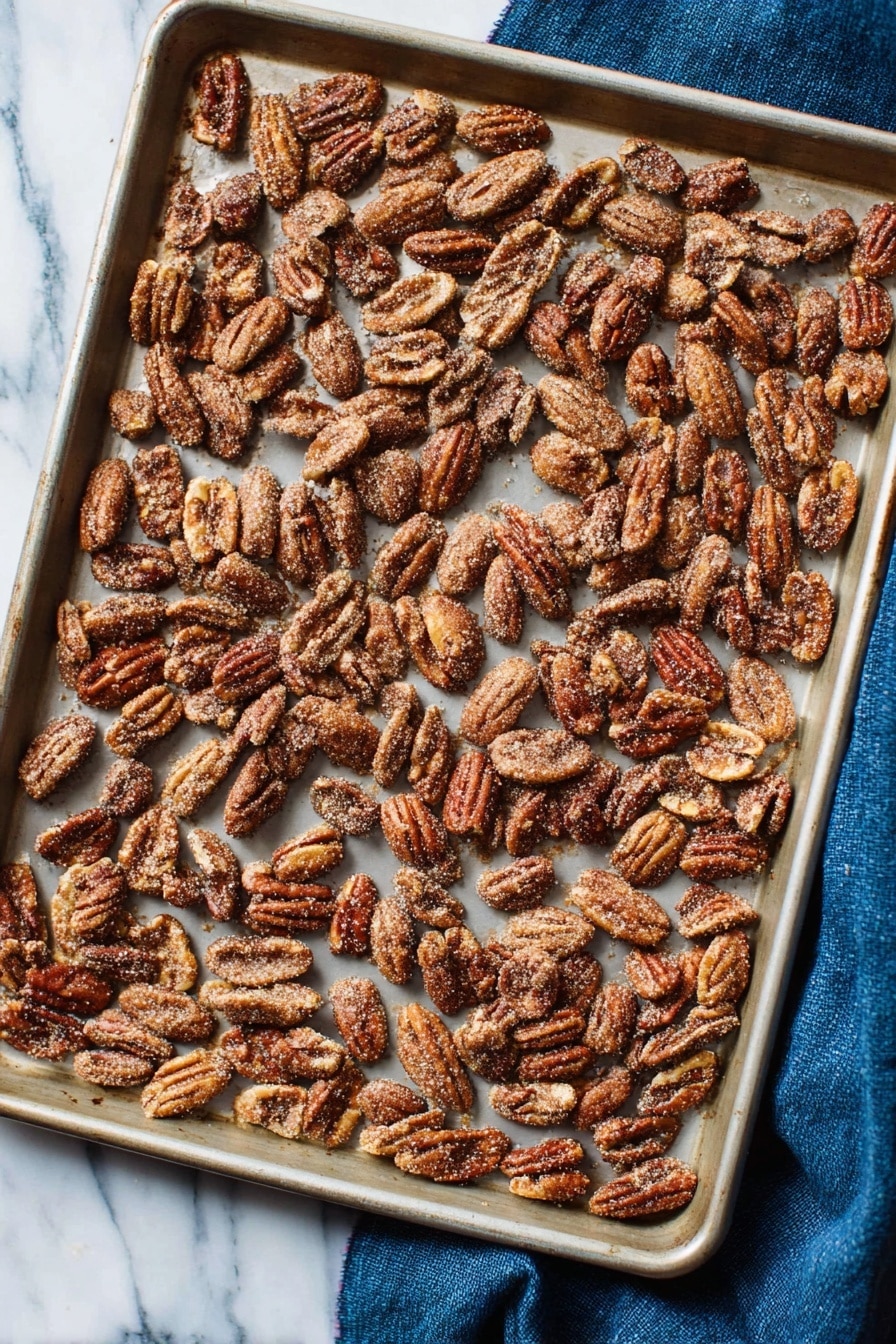 Once baked and perfectly crisp, let your cinnamon candied pecans cool completely on the pan. They will harden as they cool, giving you that satisfying snap with every bite. Store them in an airtight container to keep them fresh—and yes, I promise they’ll last long because they’re that addictive.