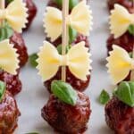 - Assemble Skewers: To serve, thread one piece of bowtie pasta, one fresh basil leaf, and one sauced meatball onto each toothpick or wooden skewer for a bite-sized appetizer.