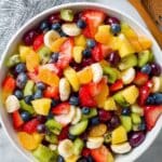 A vibrant and refreshing Colorful Honey Lime Rainbow Fruit Salad featuring a medley of fresh strawberries, pineapple, blueberries, red grapes, kiwis, mandarin oranges, and optional bananas, all tossed in a zesty honey-lime dressing. Perfect for summer gatherings, cookouts, or holiday parties, this salad combines a beautiful array of colors and flavors with a sweet and tangy finish.