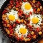 This Corned Beef Hash and Eggs recipe transforms leftover corned beef into a delicious and hearty one-skillet breakfast. Combining tender corned beef, crispy Yukon gold potatoes, sautéed red bell peppers, onions, and perfectly cooked eggs, it’s an ideal meal for a satisfying morning or brunch.