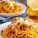 - Assemble in Baking Dish: Transfer the Alfredo-coated spaghetti into the prepared baking dish, spreading it evenly. Spoon the meat sauce over the top, covering the noodles.