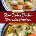 This slow cooker chicken stew is a creamy and hearty dish perfect for chilly nights. Made with tender chicken breasts or thighs, potatoes, carrots, celery, and peas in a rich broth enhanced with white wine, tomato paste, and herbs, it offers a comforting and easy-to-make meal that the whole family will love.