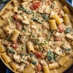 Tuscan Chicken Pasta is a creamy, comforting dish featuring rigatoni pasta tossed in a rich cream sauce with fresh spinach, sun-dried and cherry tomatoes, and parmesan cheese, all topped with perfectly seasoned and cooked boneless skinless chicken breasts. This recipe blends Italian-inspired flavors with a luscious sauce that makes for a satisfying weeknight dinner or special occasion meal.