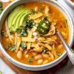 This Creamy White Bean Chicken Enchilada Soup is a comforting and flavorful dish, made extra creamy by blending white beans instead of using dairy. Packed with protein, aromatic spices, and fresh veggies, this soup is perfect for lunch or dinner and garnished with tortilla chips, avocado, jalapenos, and lime wedges for a delicious Mexican-inspired meal.