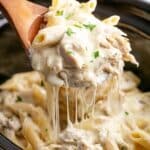 Put the lid on and cook on low for 2 ½ to 3 hours. I find cooking on low breaks down the pasta beautifully without it getting mushy. Keep an eye on it near the end—you want the pasta tender but not falling apart.