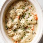 For special occasions, I serve this Crockpot Chicken and Dumplings in rustic individual bowls sprinkled with a bit of smoked paprika for a subtle smoky flavor and extra visual pop. Layering the dumplings over the chicken and veggies just so makes it look like a cozy casserole—and people always comment on how inviting it looks!