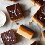 Pour the ganache over the set caramel layer and smooth out with a spatula. For the finishing touch, sprinkle flaky sea salt across the top to create that amazing sweet-salty contrast that my family goes crazy for. Allow everything to set at room temperature or pop it in the fridge if you’re in a hurry. Once firm, slice into 28 delightful squares and prepare for compliments!