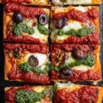 Classic Detroit-Style Pizza features a thick, airy crust baked in a rectangular pan with Wisconsin brick cheese pressed against the edges to create a crispy, caramelized cheese crust. Topped with pepperoni and spooned with marinara sauce after baking, then finished with a flavorful garlic basil oil drizzle for a deliciously unique pizza experience.