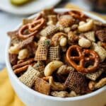 - Combine Mix Ingredients: In a large bowl, add the corn squares, wheat squares, mini pretzels, pumpernickel chips, white cheddar cheese crackers, and cashews. Gently mix them together to combine evenly.