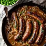 - Serve: Return the cooked sausages to the skillet or plate and ladle plenty of the onion gravy over them. Serve immediately with creamy mashed potatoes and peas on the side. For a low-carb option, substitute mashed potatoes with creamy cauliflower mash.