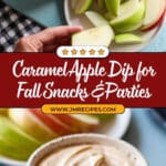 For fall gatherings, I love setting the dip in a mini pumpkin or hollowed-out apple to wow guests. You can also create a rustic charcuterie board with apple slices, nuts, cheese, and various dippers centered around this caramel apple dip for a stunning presentation.