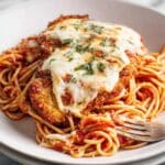 - Garnish and Serve: Remove from oven, garnish with fresh chopped basil leaves, and serve hot over cooked spaghetti noodles with extra marinara sauce if desired.