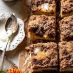 To reheat, I usually pop slices in the oven at 300°F for about 10 minutes or microwave for 20-30 seconds. Heated this way, the cake regains its just-baked softness and the cinnamon sugar topping perks right back up.