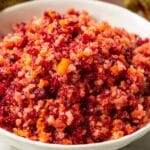Grandma’s Cranberry Relish is a classic, old-fashioned recipe featuring fresh cranberries, navel orange, and granny smith apple finely chopped and sweetened with sugar. This vibrant and tangy relish is perfect as a festive accompaniment to Thanksgiving turkey or Christmas dinner, offering a refreshing balance of sweet and tart flavors with a hint of cinnamon.