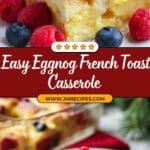 Pair this Eggnog French Toast Bake Recipe with crispy bacon or sausage links to balance the sweetness. Fresh fruit, like sliced oranges or a mixed berry salad, also brightens the plate and keeps the meal feeling fresh and festive.