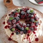 A beautiful and festive Christmas Pavlova Wreath topped with whipped cream, fresh berries, pomegranate, mint leaves, and a drizzle of raspberry coulis. This show-stopping dessert combines a crisp meringue wreath baked to perfection with light, fluffy cream and vibrant fruits for a delightful holiday treat.