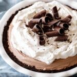- French Silk Pie features an Oreo cookie crust, rich and creamy chocolate filling, and is topped with homemade whipped cream and chocolate shavings!