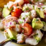 - Add avocado then serve: Sprinkle salt over the ceviche mixture, then fold in the avocado cubes, chopped coriander, and drizzle with extra virgin olive oil. Gently stir to combine and serve immediately with corn chips or crostini. Note that ceviche is best enjoyed fresh within 20 minutes to avoid overcooking and firming of the fish.