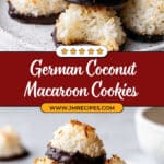 Kokosmakronen are traditional German coconut macaroon cookies that boast a crisp and crunchy exterior with a moist and chewy interior. Made with only five simple ingredients and prepared in one bowl without the need to whip egg whites, these cookies are easy and quick to bake. Optional dark chocolate dipping adds a rich finishing touch, making them perfect for a delightful treat or festive occasion.