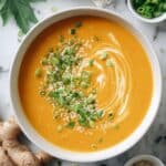 A creamy, comforting Silky Ginger Sweet Potato Soup that blends the natural sweetness of tender sweet potatoes with the warmth of fresh ginger and coconut milk, perfectly garnished with green onions and hemp hearts for a nutritious touch.