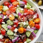 This vibrant Greek Salad features a fresh medley of cherry tomatoes, cucumbers, bell pepper, olives, red onion, and crumbled feta cheese, all tossed in a tangy homemade dressing made from extra virgin olive oil, lemon juice, red wine vinegar, garlic, and oregano. Perfect for a light meal or side dish, this healthy Mediterranean recipe comes together in just 15 minutes and is ideal for summer parties, picnics, and family gatherings.