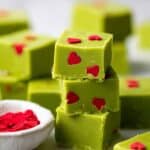 This festive Grinch Fudge combines creamy white chocolate with marshmallow cream and a bright green hue for a fun and delicious holiday treat. Sweetened with a rich sugar and evaporated milk mixture, it’s topped with red heart sprinkles to make your dessert table pop and your heart grow a little bigger this season.