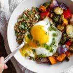 This Harvest Roasted Vegetable Grain Bowl is a nourishing, vibrant dish featuring sweet potatoes, brussels sprouts, red onion, and red pepper roasted to perfection and served over tender farro tossed in a flavorful basil vinaigrette. Topped with a perfectly cooked egg, this hearty bowl offers a delightful combination of textures and warm, autumnal flavors, making it a wholesome and satisfying meal ideal for lunch or dinner.