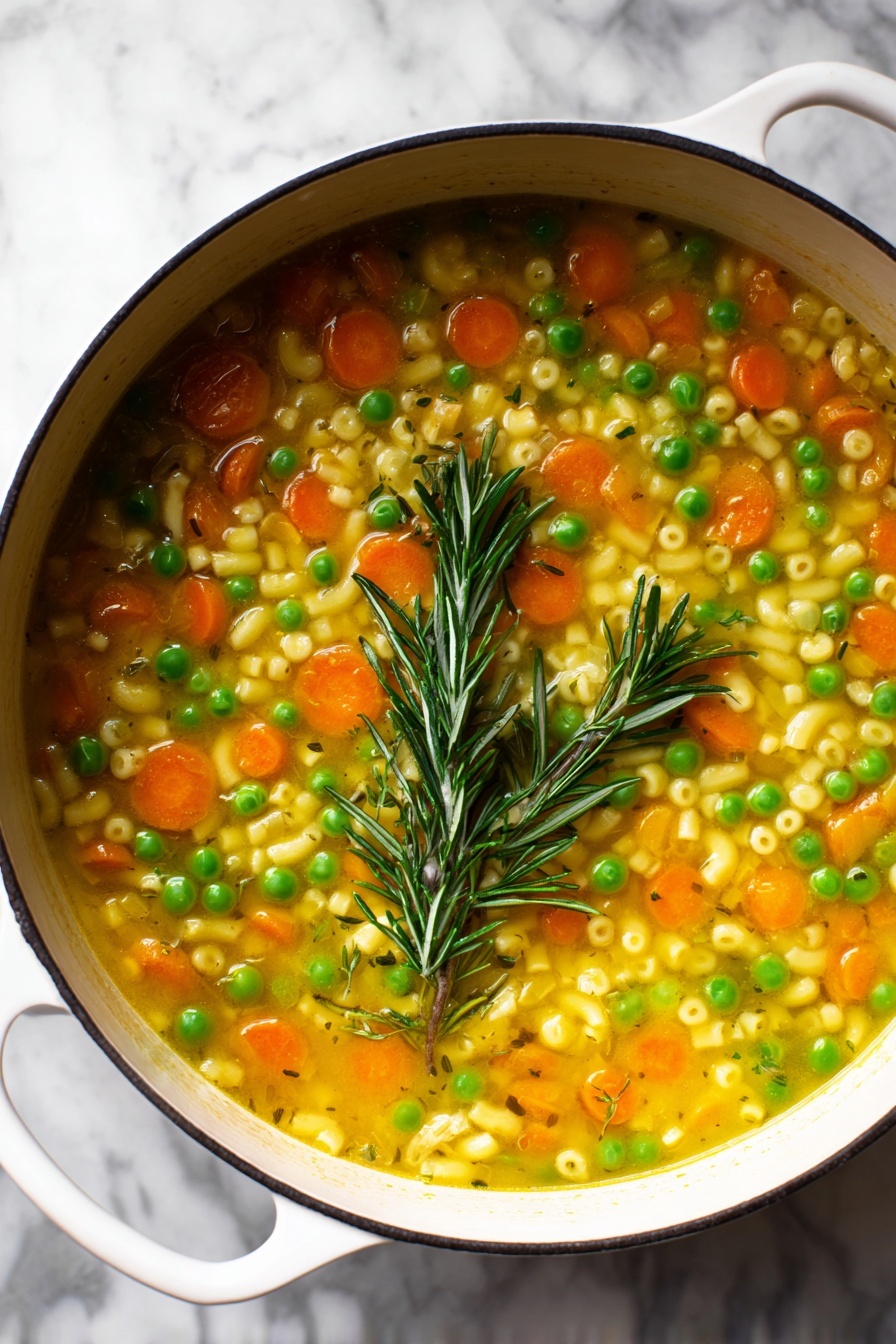 Remove the chicken with a slotted spoon and shred it right on the cutting board with two forks—that’s my trusty technique for perfectly shredded, tender chicken pieces. Toss the shredded chicken back into the pot along with frozen peas for a bright burst of color and a slight sweetness. If the broth looks a little low, add another cup of chicken broth. Taste, adjust your salt and pepper, and voila—your soup is ready to enjoy.
