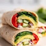 A vibrant and wholesome Veggie Wrap with Hummus, featuring crisp baby spinach, refreshing cucumber, roasted red peppers, creamy avocado, red onion, and tangy feta cheese all wrapped in a whole wheat tortilla. This quick and nutritious lunch option is perfect for a light meal or snack.
