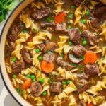 A comforting and hearty Beef Noodle Soup featuring tender stew meat, sliced mushrooms, fresh vegetables, and egg noodles simmered in a savory broth seasoned with herbs and spices. Perfect for a satisfying meal any day of the week.